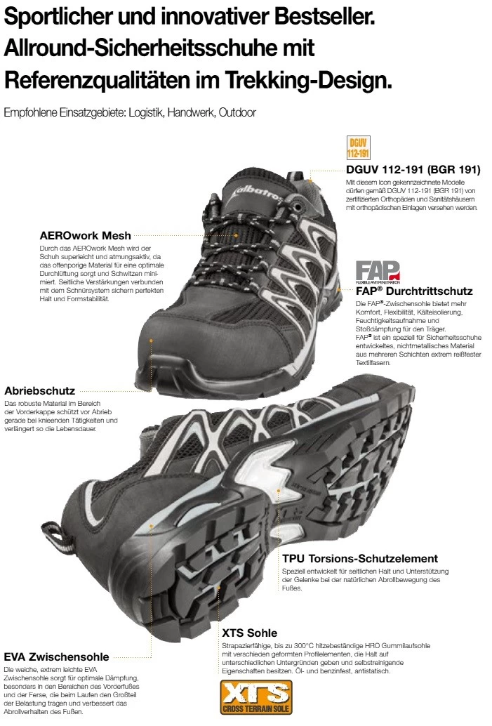 Die FAP®-Zwischensohle bietet mehr Komfort, Flexibilität, Kälteisolierung, Feuchtigkeitsaufnahme und Stoßdämpfung für den Träger. FAP® ist ein speziell für Sicherheitsschuhe entwickeltes, nichtmetallisches Material aus mehreren Schichten extrem reißfester Textilfasern