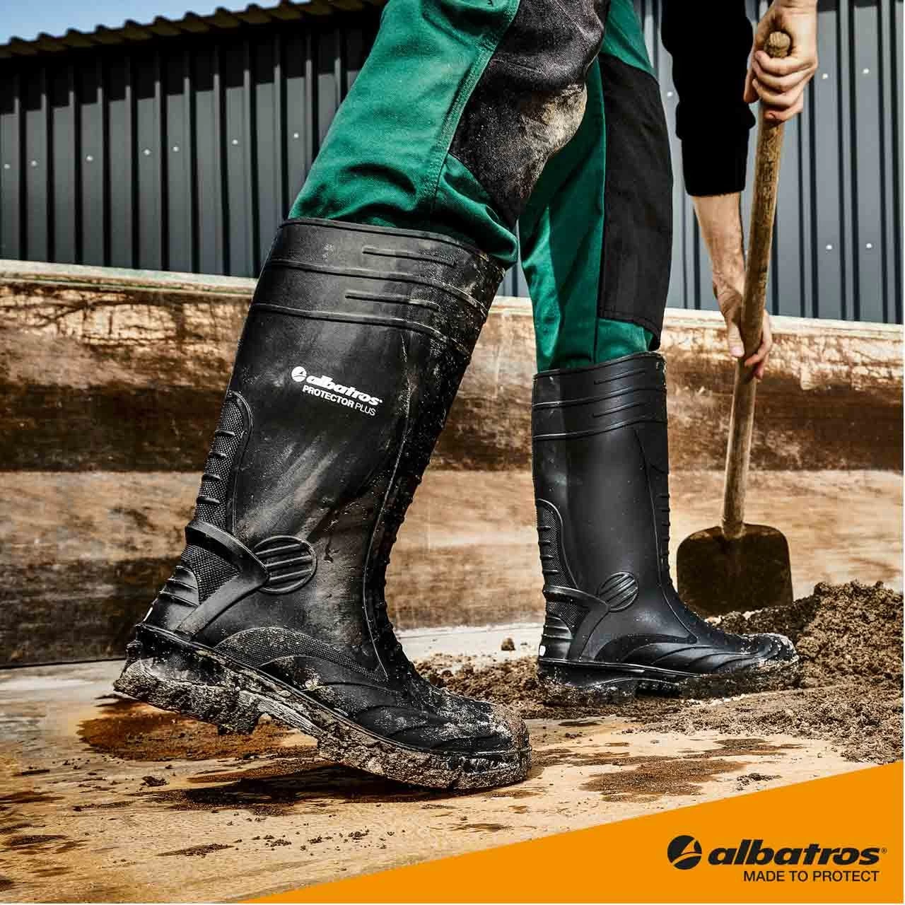 + Sohle: rutschfeste und profilierte Laufsohle beständig gegen Gülle, Kalk, Zement, Kraftstoffe, Laugen, Öle, Fette und weitestgehend gegen Säuren