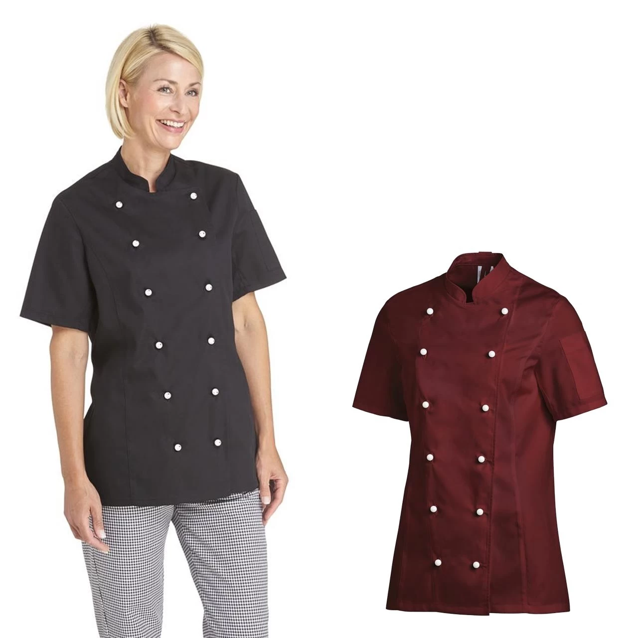 + taillierte Damen-Kochjacke, mit Teilungsnähten im Vorderteil und Rückenteil, nicht zu sehr körperanliegend