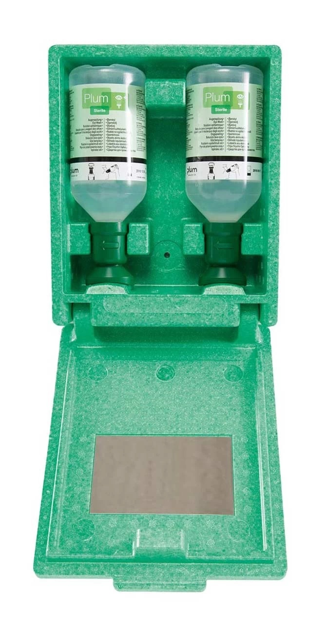 + Staubgeschützte Wandbox mit 2 x 500 ml Flaschen Augenspüllösung, Kennzeichnung Augenspülung und Spiegel